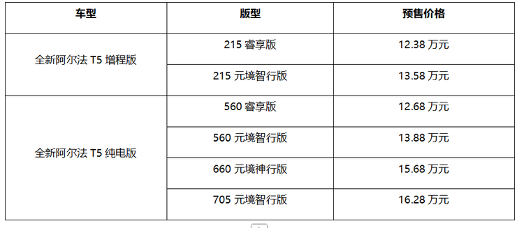 据悉,极狐全新阿尔法T5预售共推出6个版型,包含纯电和增程两种动力形式,预售价格12.38万元—16.28万元,以更年轻的设计风格、更强的动力续航、更智能的操控、更舒适的驾乘和天花板级的安全健康,为年轻家庭用户带来了中级SUV的新选择。即日起通过极狐APP或小程序支付2000元定金,购车可以享受整车5年或12万公里质保、三电终身质保、3年免费不限量数据流量、终身免费OTA升级、价值4999元充电桩安装抵扣券等四重礼遇,再次刷新中级SUV的价值标准!