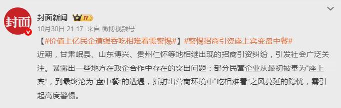 这些事件,虽然其中的是非纠葛还有待厘清,但总觉得有些蹊跷。有媒体这样谨慎的提醒:“部分民营企业从最初被奉为‘座上宾’,到最终沦为‘盘中餐’的遭遇,折射出营商环境中‘吃相难看’之风蔓延的隐忧,需引起高度警惕。”