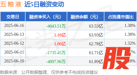 本站消息,6月16日,五 粮 液(000858)融资买入3.01亿元,融资偿还3.42亿元,融资净卖出4043.51万元,融资余额63.53亿元翼牛网,近20个交易日中有12个交易日出现融资净买入。